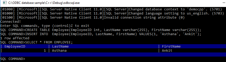 Congratulations! You have now successfully connected to Azure SQL using C++ and ODBC on Windows. You can continue reading to do the same for Linux platform as well.