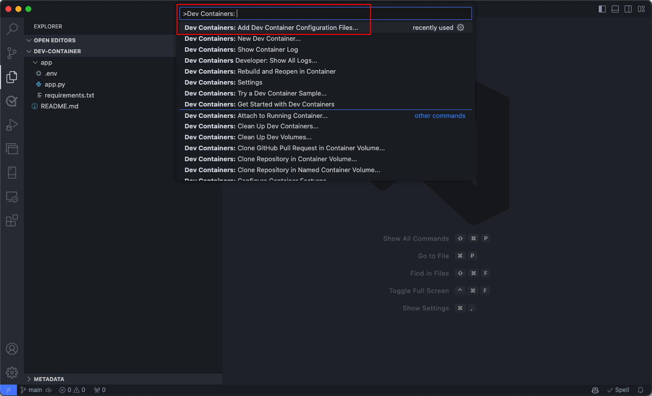 Screenshot of Visual Studio Code command palette for adding Dev Container configuration files.