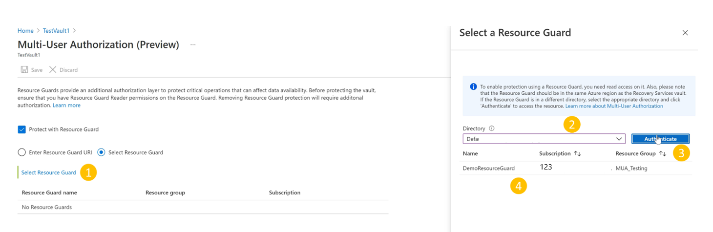 - After authentication, choose the Resource Guard from the list displayed.