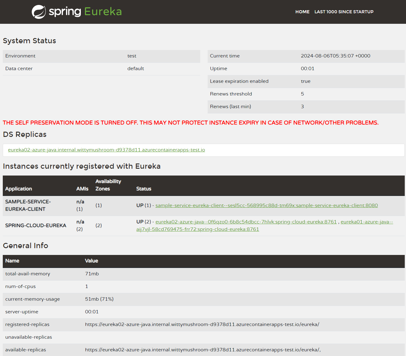 This command returns the URL you can use to access the Eureka Server for Spring dashboard. Through the dashboard, you can verify that the Eureka server setup consists of two replicas.