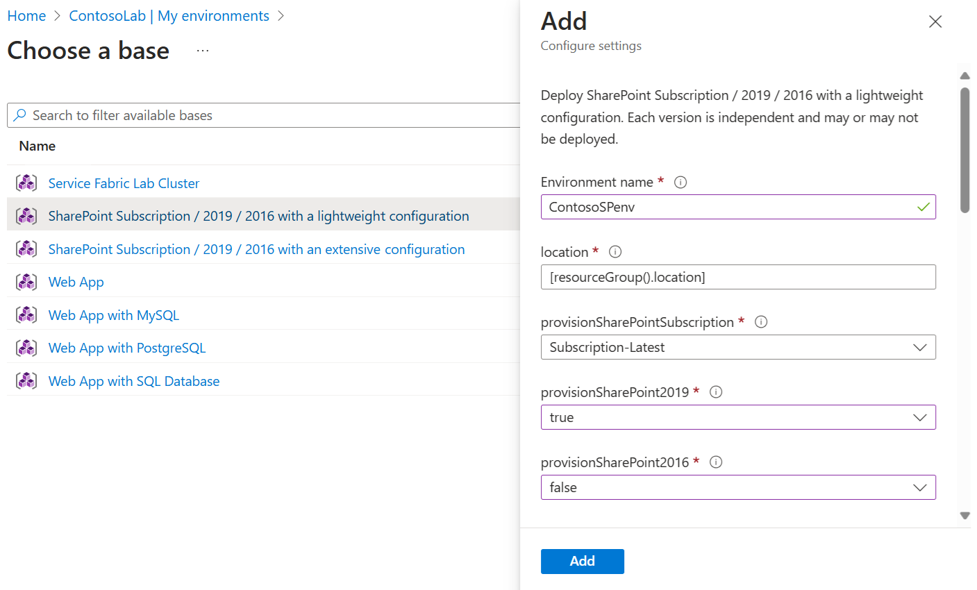 Select Add. The environment starts provisioning immediately.