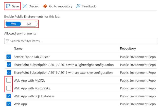 On the Public environments page, set the Enable Public Environments for this lab option to Yes or No.