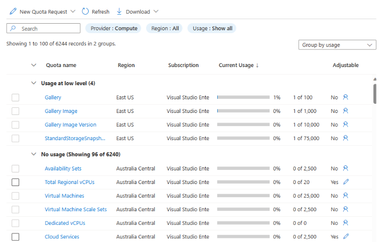 These steps show you how to view the current quotas in your subscription for specific Azure resources, and to see what percentage of each quota used.