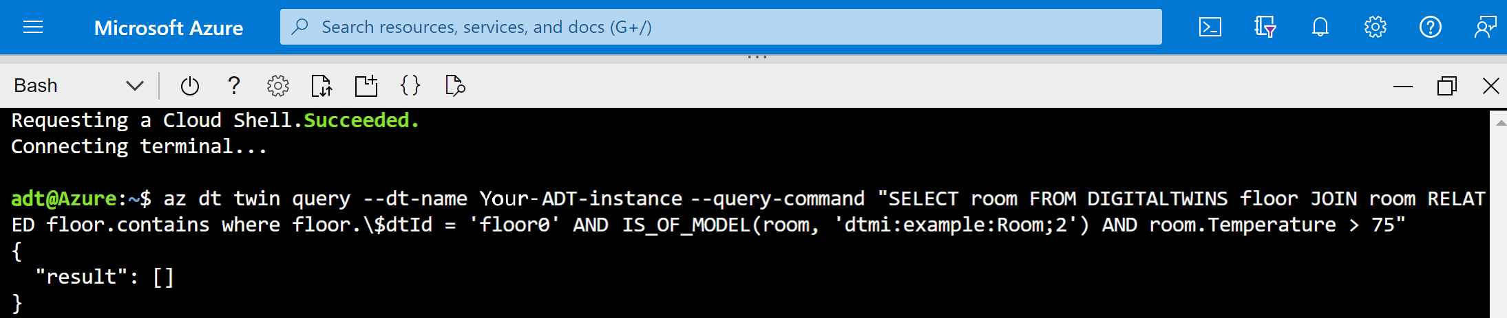 az dt twin query --dt-name <Azure-Digital-Twins-instance-hostname-or-name> --query-command "SELECT room FROM DIGITALTWINS floor JOIN room RELATED floor.contains where floor.\$dtId = 'floor0'"You can query based on relationships in your graph, to get information about how twins are connected or to restrict your query to a certain area. This query also illustrates that a twin's ID (like floor0 in the previous query) is queried using the metadata field