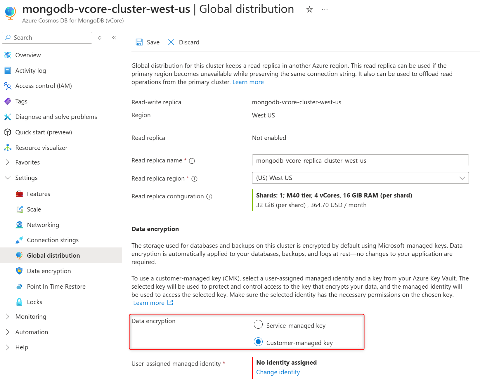 In this article, you learn how to configure customer-managed key (CMK) for data encryption at rest in Azure DocumentDB. The steps in this guide configure a new Azure DocumentDB cluster, a replica cluster, or a restored cluster. CMK setup uses customer-managed key stored in an Azure Key Vault and user-assigned managed identity.