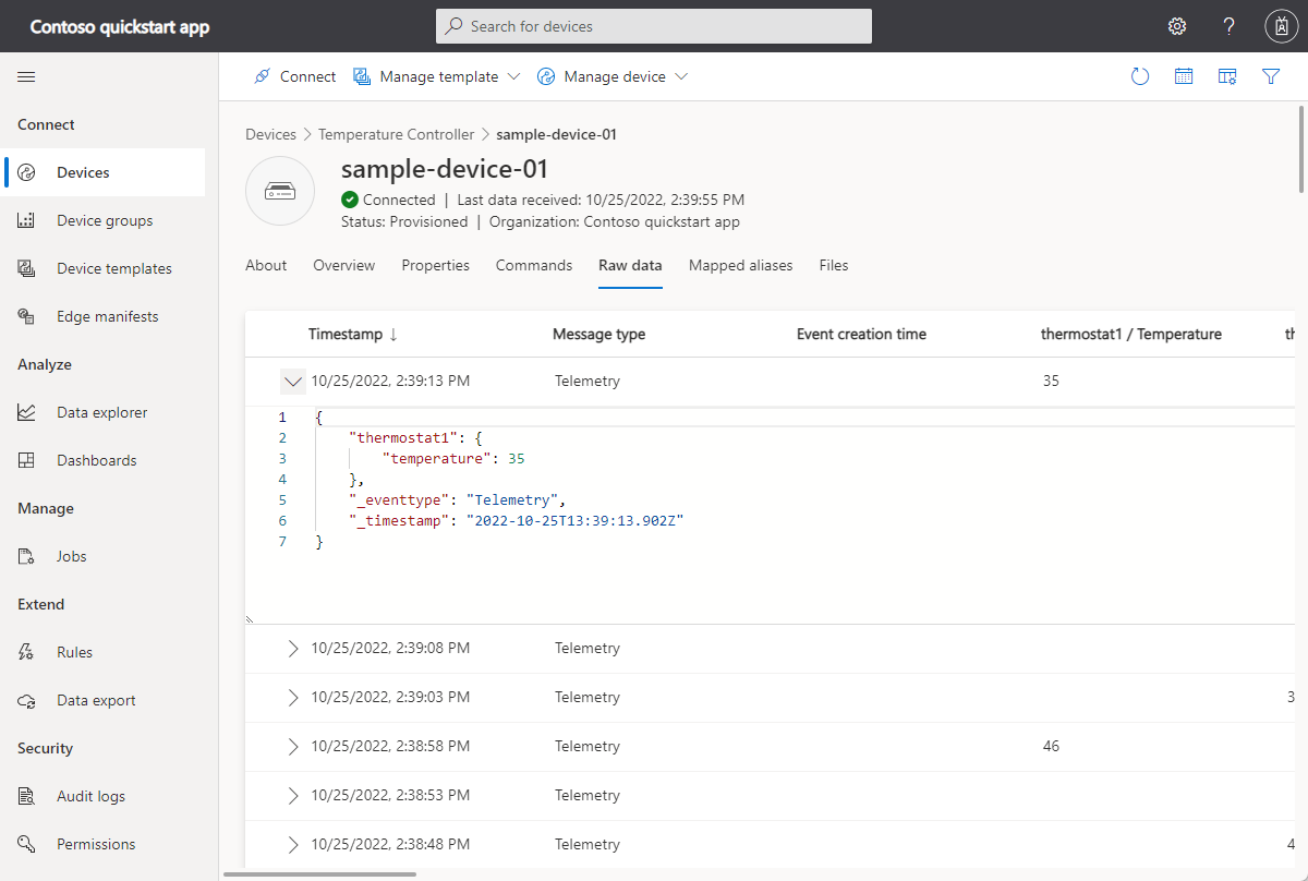 You can use the Raw data view to examine the raw data your device is sending to IoT Central: