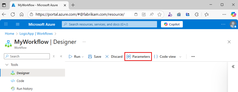 Standard workflows only: To view or edit in bulk JSON, on the resource sidebar menu, select Parameters. On the Parameters pane, select Edit in JSON.