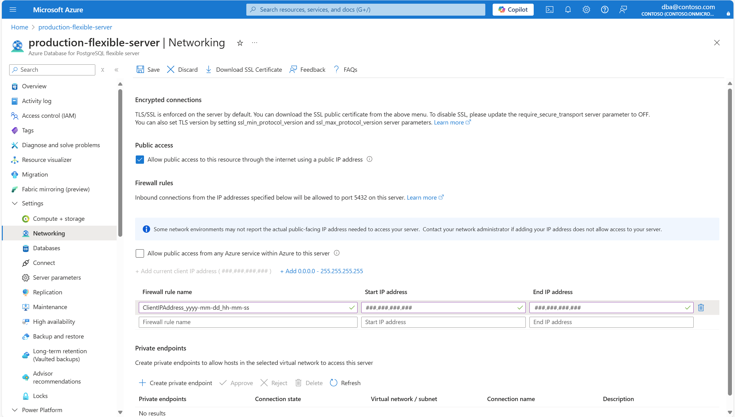 With public access enabled, you can configure firewall rules to allow connections originating from specific IP addresses, or from any Azure service.