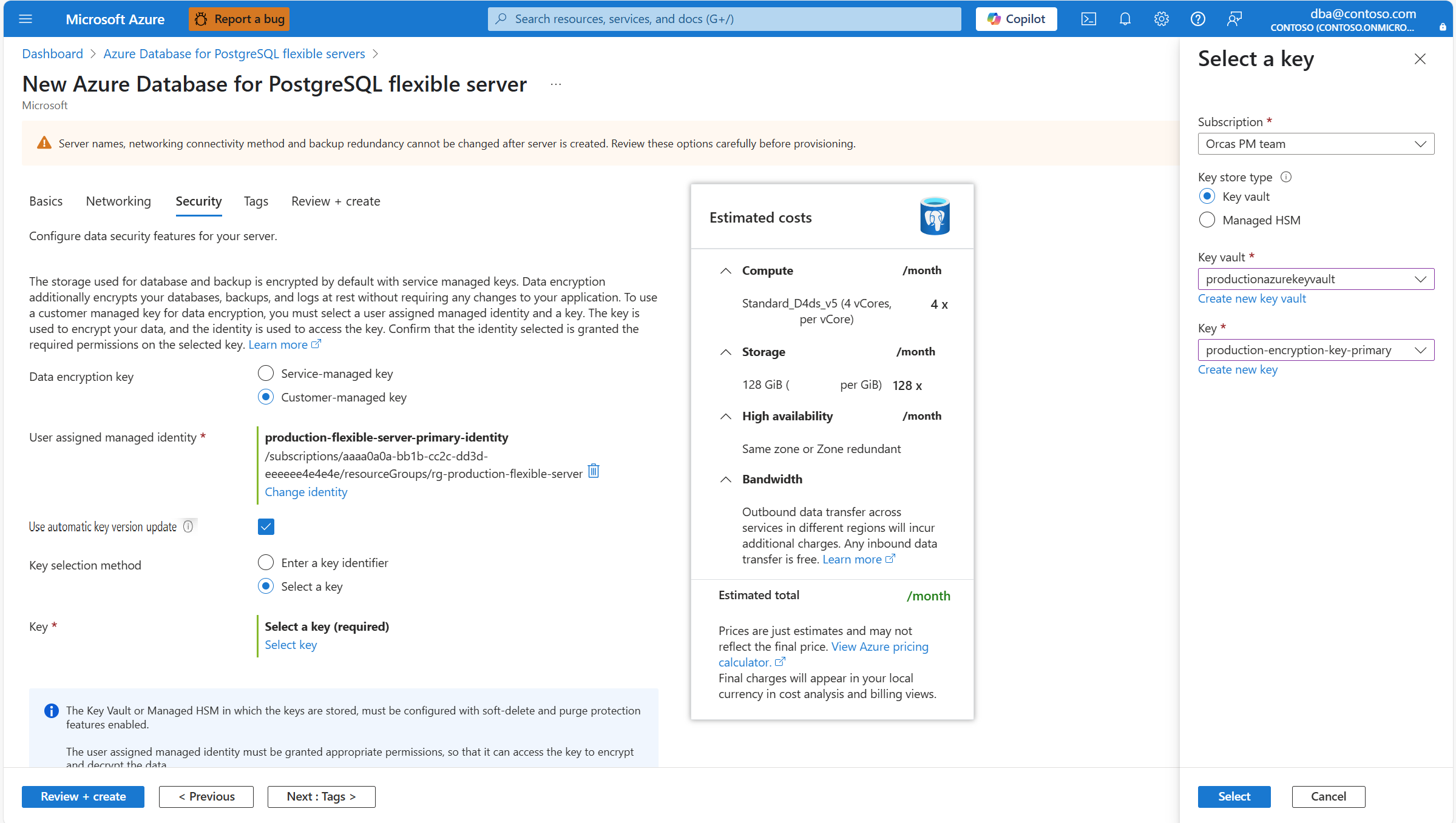 If you enable geo-redundant backup storage to be provisioned together with the server, the aspect of the Security tab changes slightly because the server uses two separate encryption keys. One for the primary region in which you're deploying your server, and one for the paired region to which the server backups are asynchronously replicated.