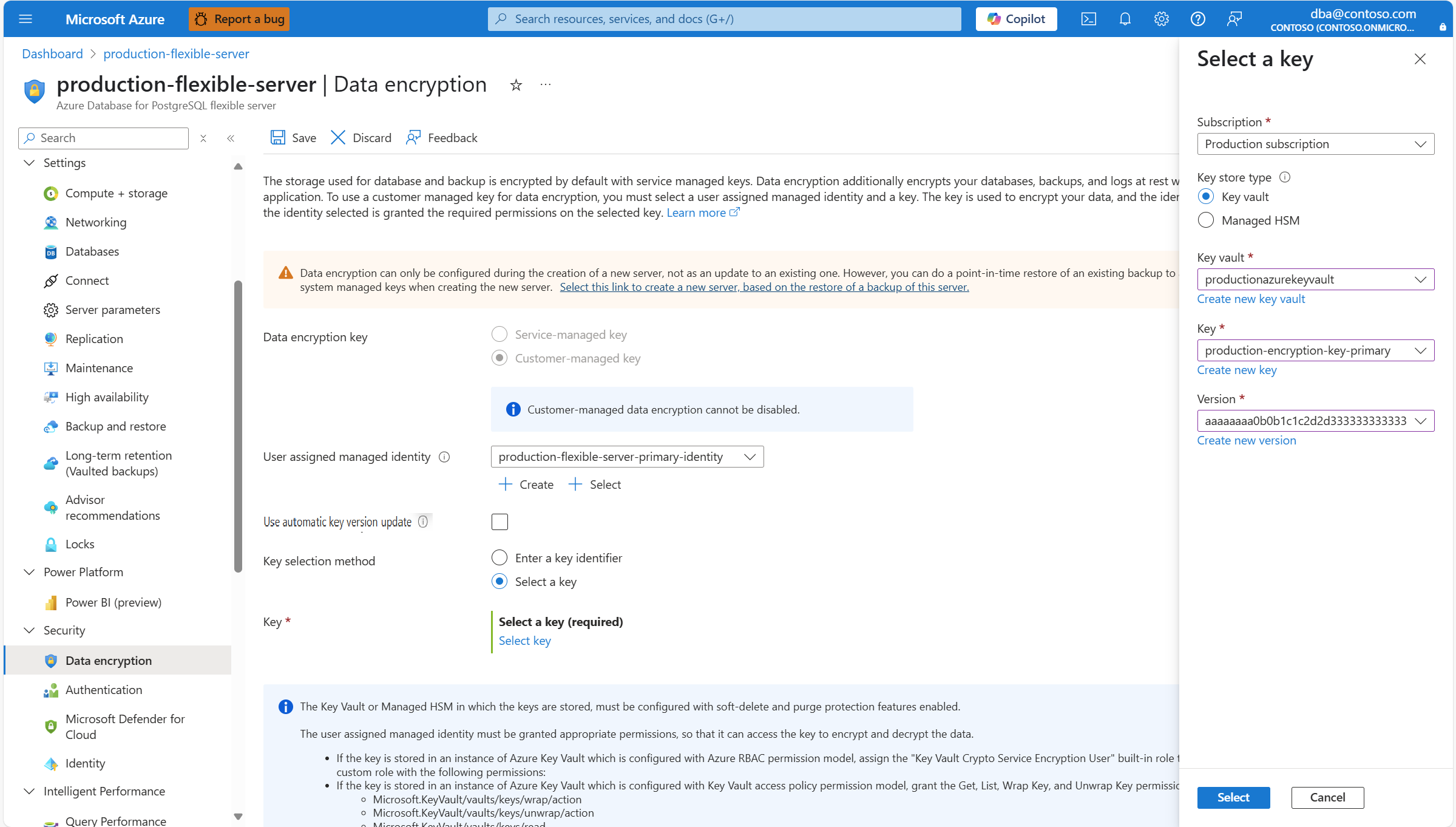 If you rotate the key and don't have Use automatic key version update enabled. Or if you want to use a different key, you must update your Azure Database for PostgreSQL flexible server instance, so that it points to the new key version or new key. To do that, you can copy the resource identifier of the key, and paste it in the Key identifier box.