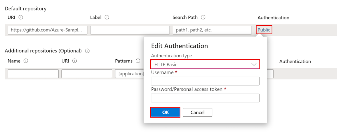 Azure Spring Apps can access Git repositories that are public, secured by SSH, or secured using HTTP basic authentication. HTTP basic authentication is the easiest of the options for creating and managing repositories with Azure Repos.