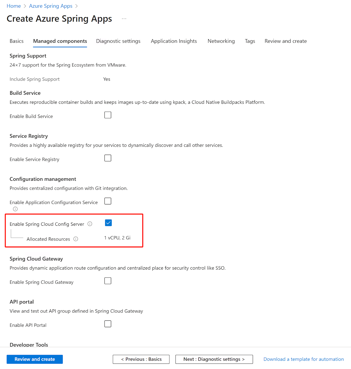 On the Managed components tab, select Enable Spring Cloud Config Server.