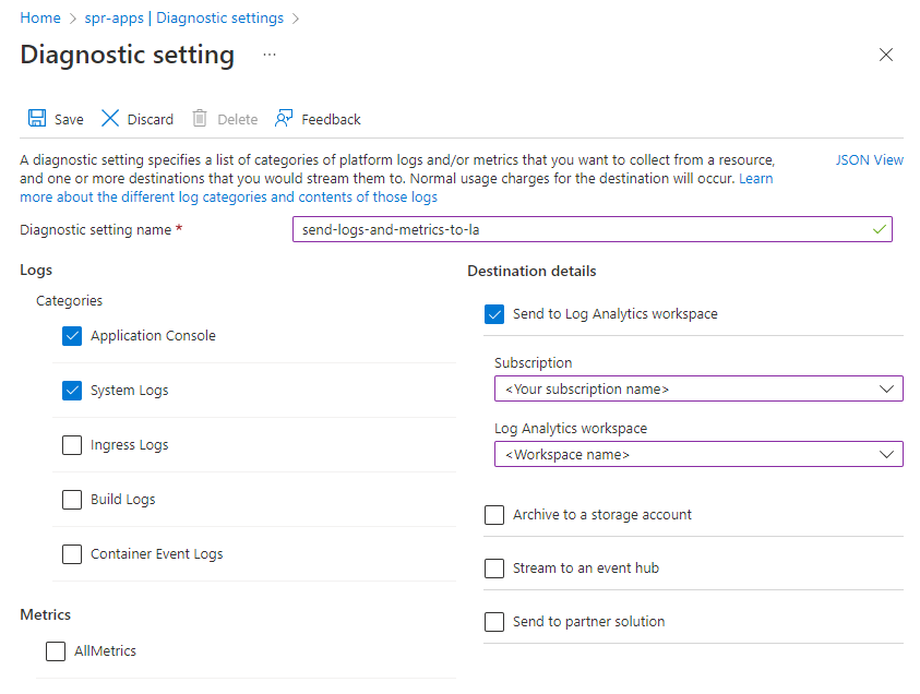 - Logs > Categories: Select ApplicationConsole and SystemLogs. For more information on log categories and contents, see Diagnostic settings in Azure Monitor.