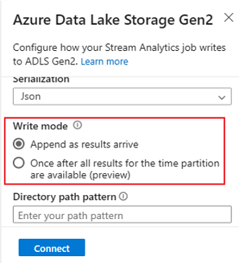 When you're connecting to Azure Data Lake Storage Gen2, if you select Managed Identity as the authentication mode, then the Storage Blob Data Contributor role will be granted to the managed identity for the Stream Analytics job. To learn more about managed identities for Azure Data Lake Storage Gen2, see Use managed identities to authenticate your Azure Stream Analytics job to Azure Blob Storage.