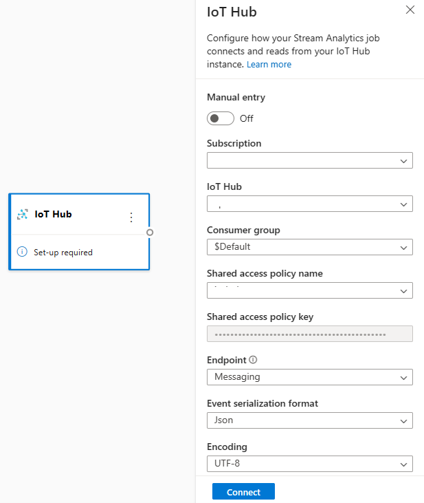 To add an IoT hub as a streaming input for your job, select the IoT Hub under Inputs from the ribbon. Then fill in the needed information in the right panel to connect IoT hub to your job. To learn more about the details of each field, see Stream data from IoT Hub to Stream Analytics job.