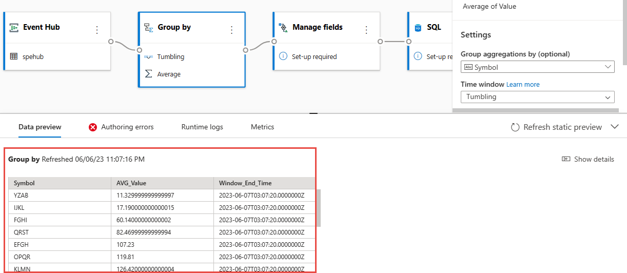 AVG_ValuetoValue. After you save the selections, you see data in the Data preview pane.In the following example, Symbol and AVG_Value are selected. Symbol is mapped to symbol, and AVG_Value is mapped to price.