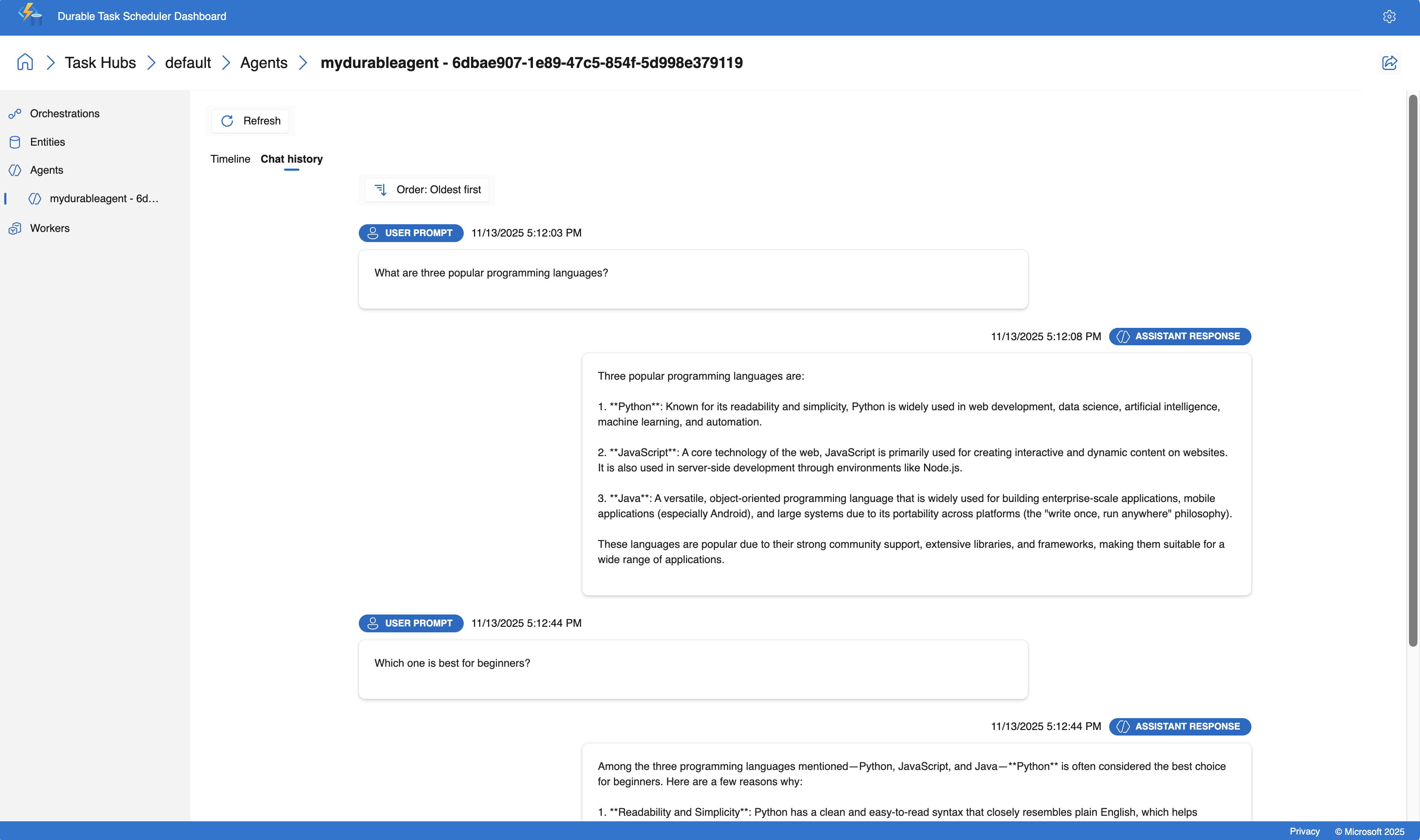 runtimeStatusisCompleted. When complete, you'll see the orchestration output with the main agent's response and its translations:{ "name": "agent_orchestration_workflow", "instanceId": "abc123def456", "runtimeStatus": "Completed", "output": { "original": "Three popular programming languages are Python, JavaScript, and Java. Python is known for its simplicity...", "french": "Trois langages de programmation populaires sont Python, JavaScript et Java. Python est connu pour sa simplicité...", "spanish": "Tres lenguajes de programación populares son Python, JavaScript y Java. Python es conocido por su simplicidad..." } }
