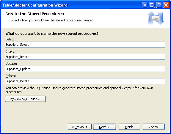 Upon clicking Finish, the wizard will create the four stored procedures and add the TableAdapter and corresponding DataTable to the Typed DataSet.