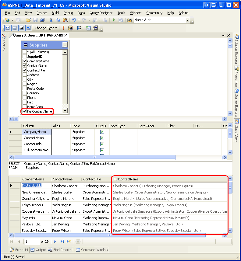 Before we start work on the Data Access Layer, let s take a minute to view the FullContactName values. From the Server Explorer, right-click on the Suppliers table name and choose New Query from the context-menu. This will bring up a Query window that prompts us to choose what tables to include in the query. Add the Suppliers table and click Close. Next, check the CompanyName, ContactName, ContactTitle, and FullContactName columns from the Suppliers table. Finally, click the red exclamation point icon in the Toolbar to execute the query and view the results.
