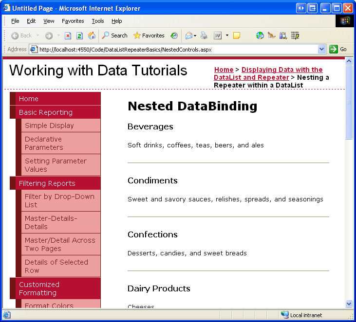In this tutorial we will explore how to use a Repeater nested inside another Repeater. The outer Repeater will contain an item for each category in the database, displaying the category s name and description. Each category item s inner Repeater will display information for each product belonging to that category (see Figure 1) in a bulleted list. Our examples will illustrate how to populate the inner Repeater both declaratively and programmatically.