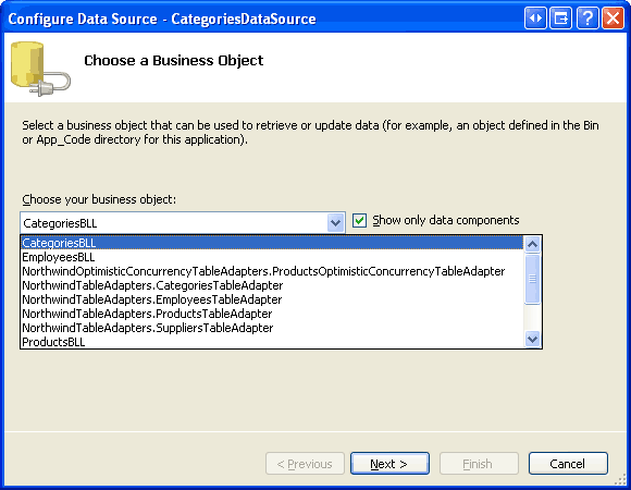 Figure 8: Configure the ObjectDataSource to Use the CategoriesBLL Class (Click to view full-size image)