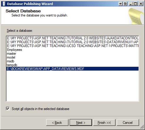 The second screen in the wizard lists the databases accessible to the Database Publishing Wizard and lets you choose whether to script all objects in the selected database or to pick which objects to script. Select the appropriate database and leave the "Script all objects in the selected database" option checked.