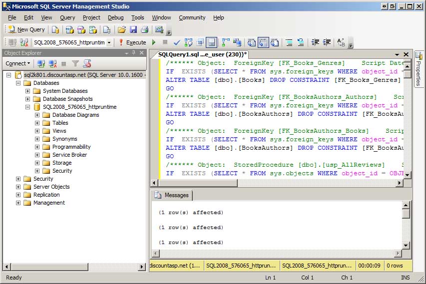 Now that we have the script that contains the SQL commands to create the database and its data all that remains is to execute the script on the production database. Some web host providers offer a textbox in their Control Panel where you can enter SQL commands to execute on your database. If you have a very large script file then this option might not work (the REVIEWS.MDF.sql script file is over 425 KB in size, for instance).