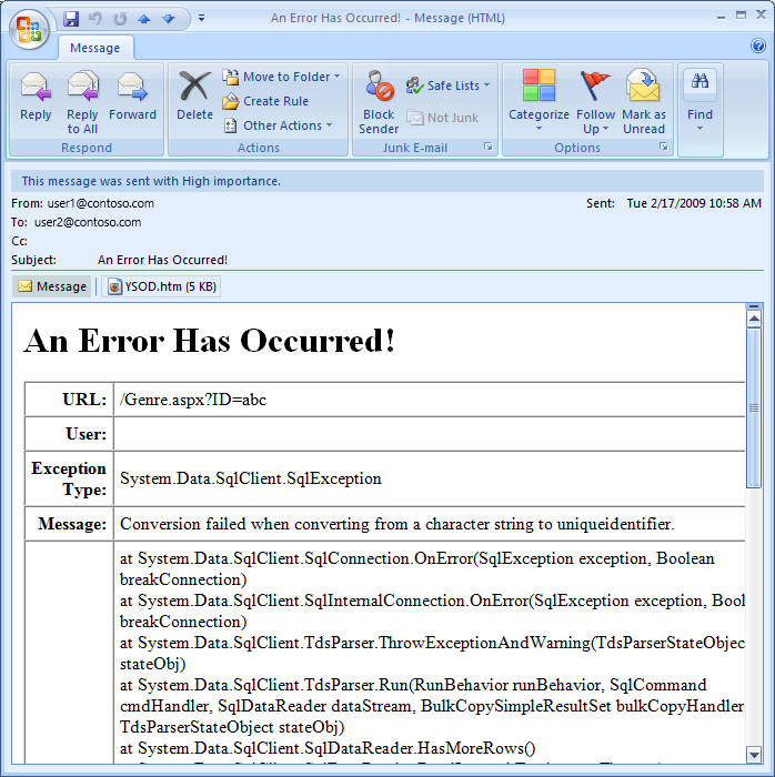 Figure 2 shows the email received when visiting Genre.aspx?ID=foo. The email body summarizes the exception information, while the YSOD.htm attachment displays the content that is shown in the Exception Details YSOD (see Figure 3).