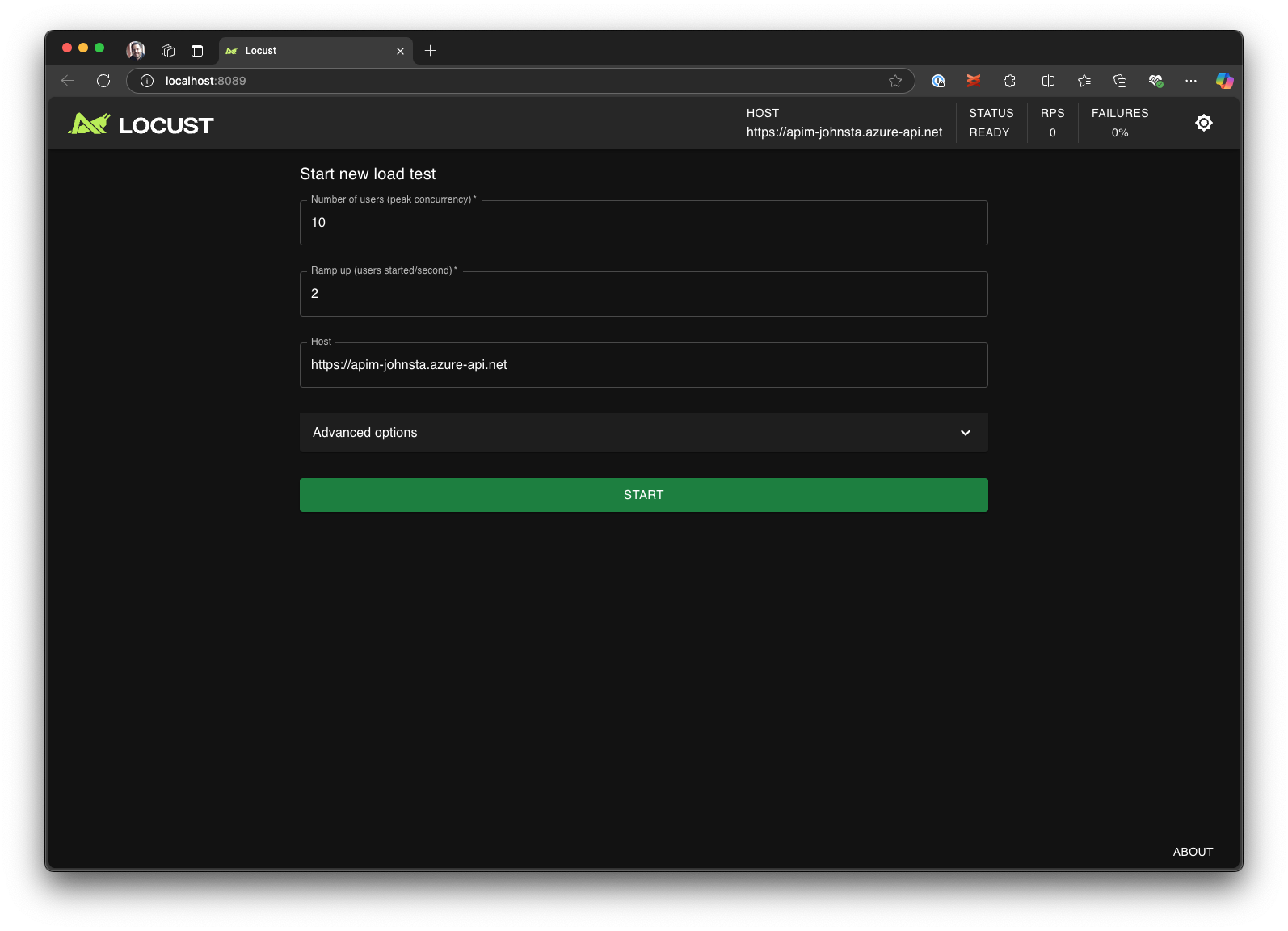 3. Open a browser to http://0.0.0.0:8089 to view the Locust web UI.