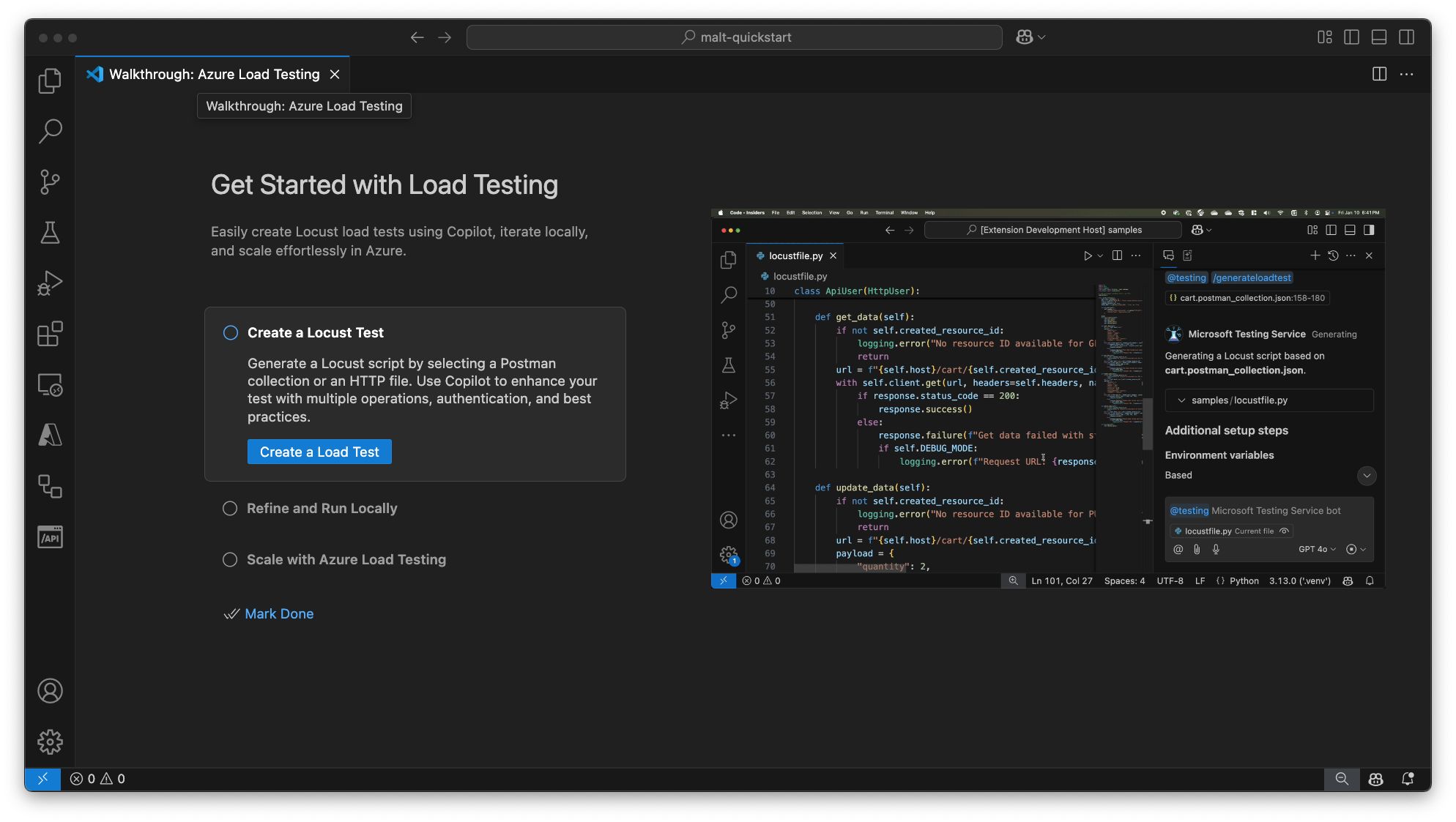 1. Click the Create a Load Test button in the walkthrough, or run Load Testing: Create Locust test from the command palette.