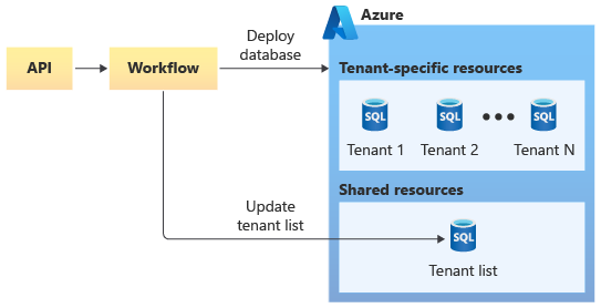 The API asynchronously starts a workflow that onboards their new tenants. The workflow initiates the deployment of a new Azure SQL database, which might use one of the following approaches: