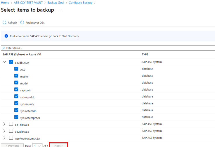 17. On the Select items to backup pane, select the Databases for protection, and then select Next.