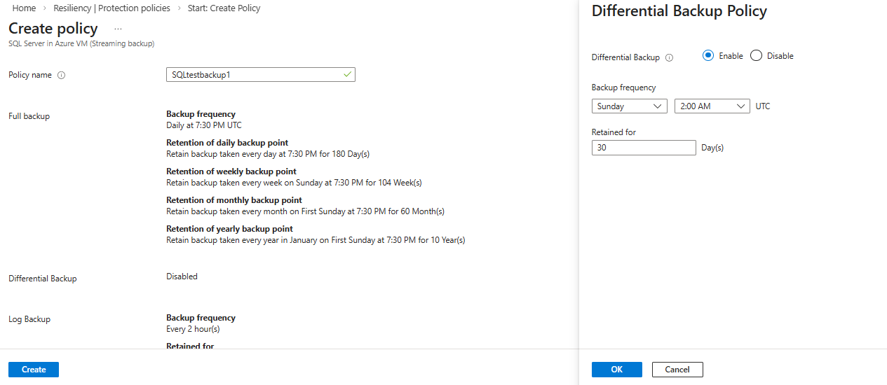 On the Differential Backup Policy pane, configure the following settings: