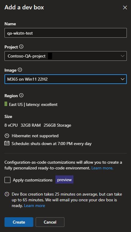 - A notification that the dev box creation process can take 25 minutes or longer.