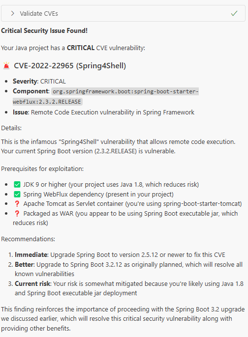 validate_cves_for_javaScans your project for known Java-related Common Vulnerabilities and Exposures (CVEs) and validates that critical vulnerabilities are addressed.
