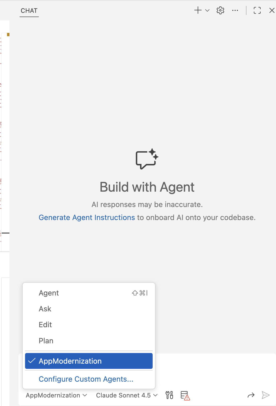 The AppModernization custom agent provides the best experience for Java application migration and modernization tasks. Use the following steps to select it:
