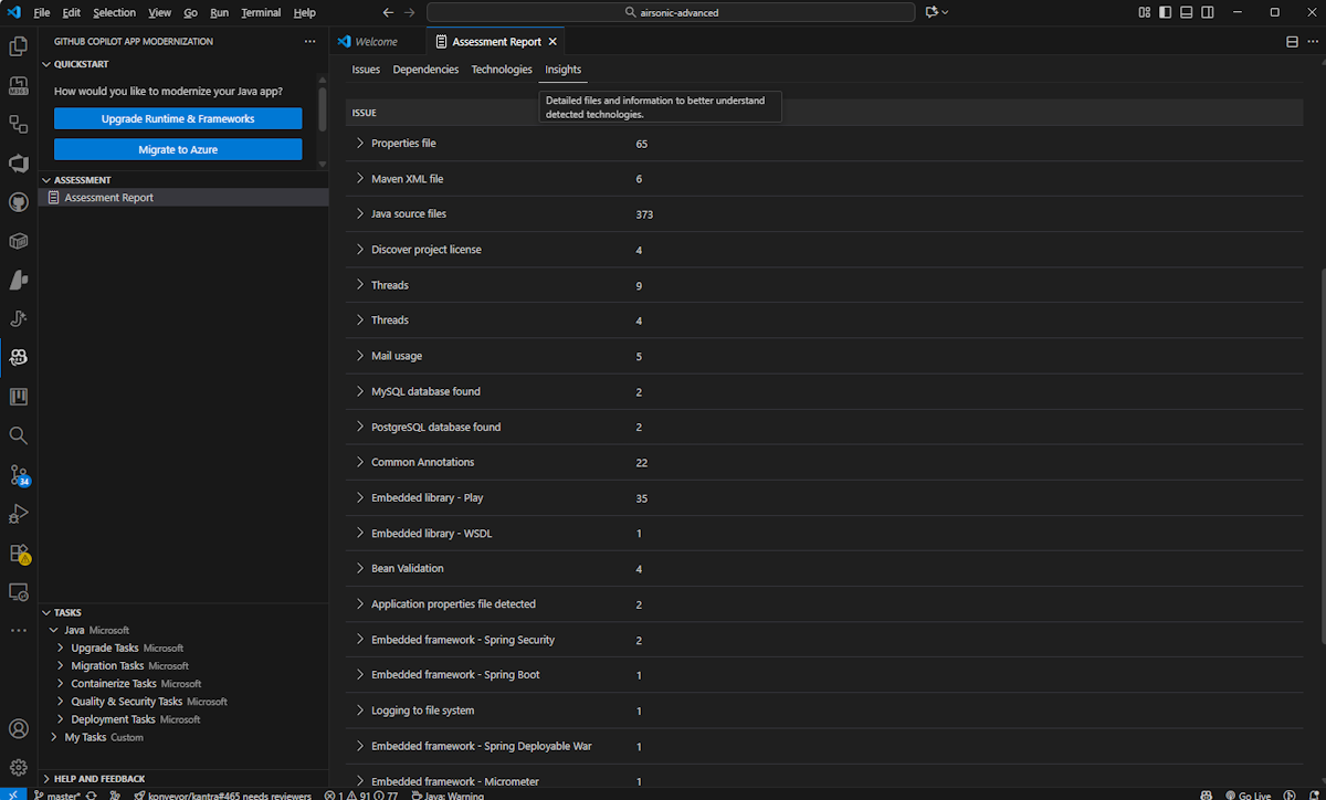 - Application Information: Basic information about your application including Java version, frameworks, build tools, project structure, and target Azure service.