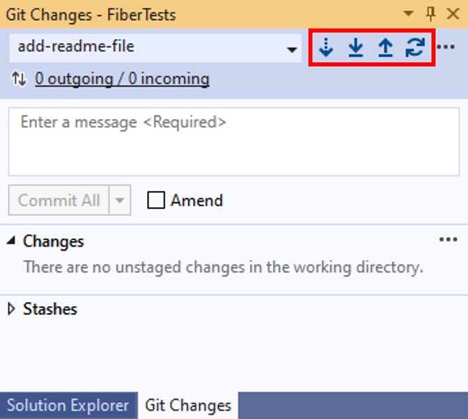 In the Git Changes window, you can keep your local branch current with its remote counterpart by using the Fetch, Pull, Push, and Sync buttons.