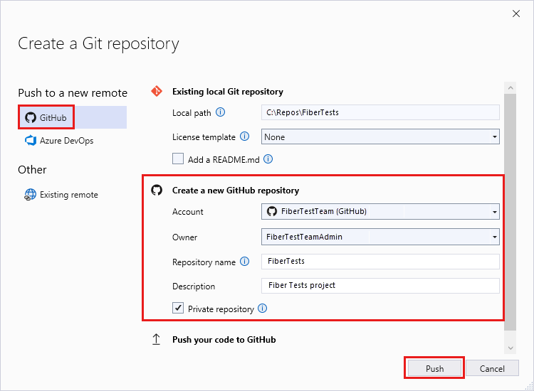 In the Create a Git repository dialog, select GitHub. Enter any required values under Create a new GitHub repository. Then select Push.