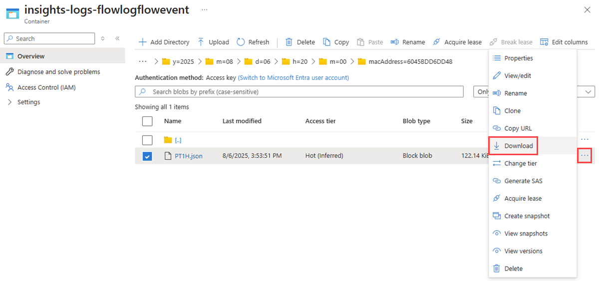 PT1H.jsonfile that you want to download. Virtual network flow log files follow the following path::https://{storageAccountName}.blob.core.windows.net/insights-logs-flowlogflowevent/flowLogResourceID=/{subscriptionID}_NETWORKWATCHERRG/NETWORKWATCHER_{Region}_{ResourceName}-{ResourceGroupName}-FLOWLOGS/y={year}/m={month}/d={day}/h={hour}/m=00/macAddress={macAddress}/PT1H.jsonSelect the ellipsis ... to the right of the PT1H.json file, then select Download.