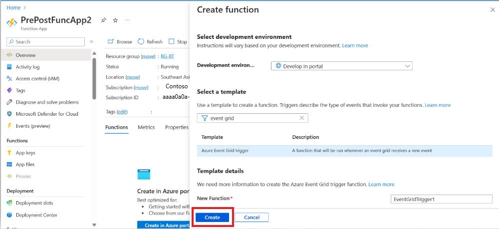 After you create the function app, go to the resource, go to Overview, and then select Create in Azure portal.