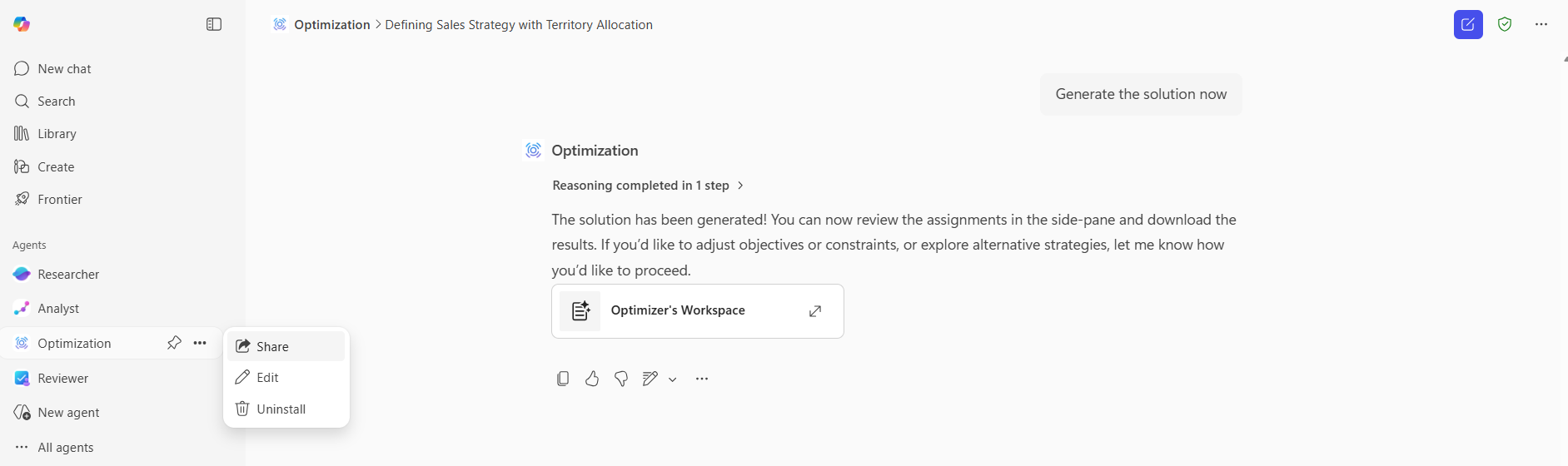 Agenten genererer automatisk beslutningsvariabler, der repræsenterer tildelingsvalg. Den beregner optimale værdier og viser resultaterne i et format, der er let at forstå.