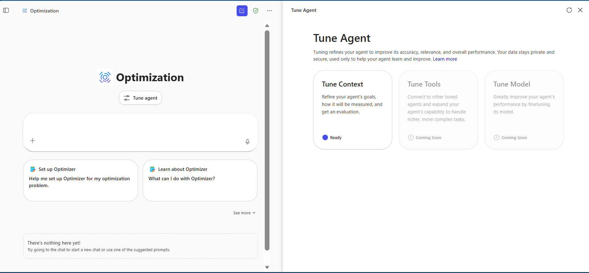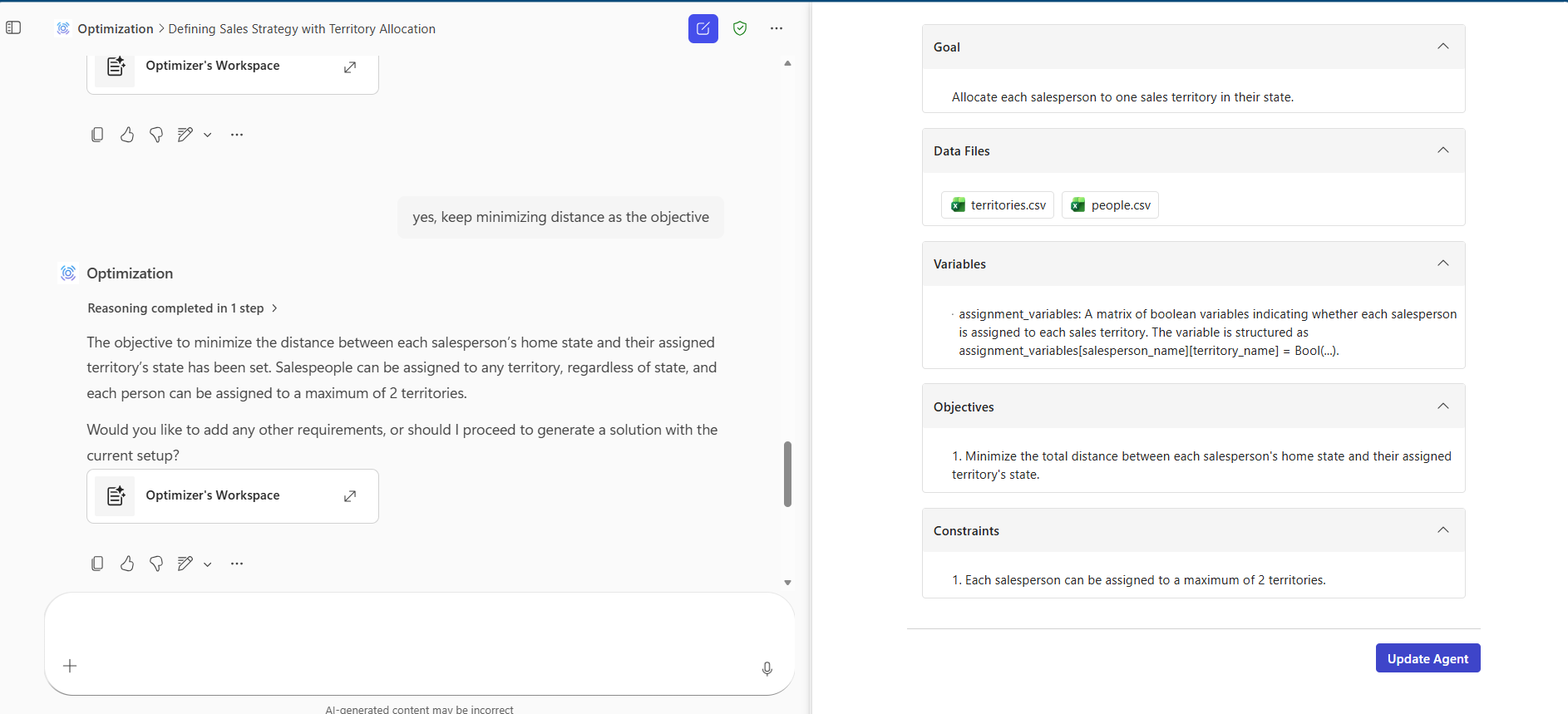 Ved hjælp af en tilpasset kontekstagent kan du gemme et brugerdefineret optimeringsproblem til genbrug på tværs af organisationen. Agenten husker din problemstruktur, herunder mål, begrænsninger, målsætninger og dataskema.