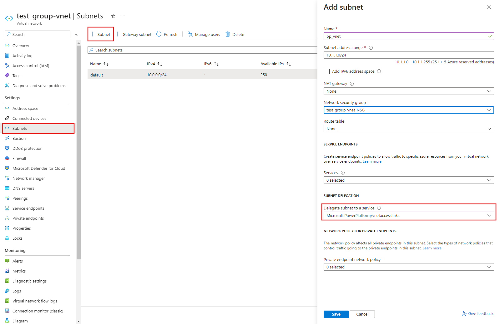 En bruger i en rolle med tilladelsen Microsoft.Network/virtualNetworks/subnets/join/action på det virtuelle netværk, f.eks. rollen Azure Network Contributor , kan delegere undernettet i det samme virtuelle netværk til Microsoft Power Platform. Delegering af undernet giver dig mulighed for at angive et bestemt undernet for en Azure PaaS-tjeneste efter eget valg, der skal sprøjtes ind i dit virtuelle netværk.