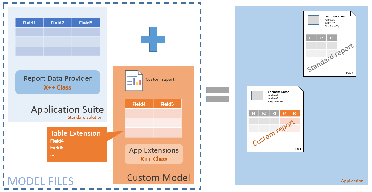 This article focuses on expanding an existing report data set that uses X++ business logic in a report data provider (RDP) class. You use custom delegate handlers and table extensions to include more field data and calculations. You don't have to over-layer the Application Suite. You then create custom designs that replace the standard application solutions and present the data to users. The following illustration shows a typical application customization, as described in this article.