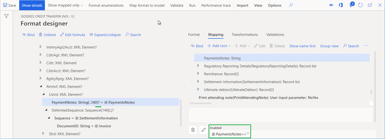 @.PaymentsNotes <> ""er defineret for komponeneten PaymentNote og gør det muligt at udfylde XML-elementet (ved at returnere SANDT) Ustrd med teksten for betalingsnoter, hvis teksten til den aktuelle kreditoverførsel ikke er tom.Udtrykket