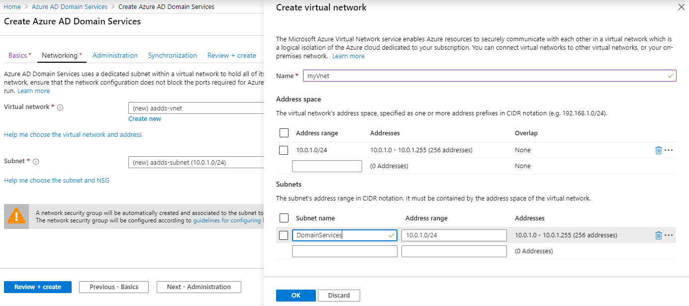 - Create a dedicated subnet with a clear name, such as DomainServices. Provide an address range, such as 10.0.1.0/24.