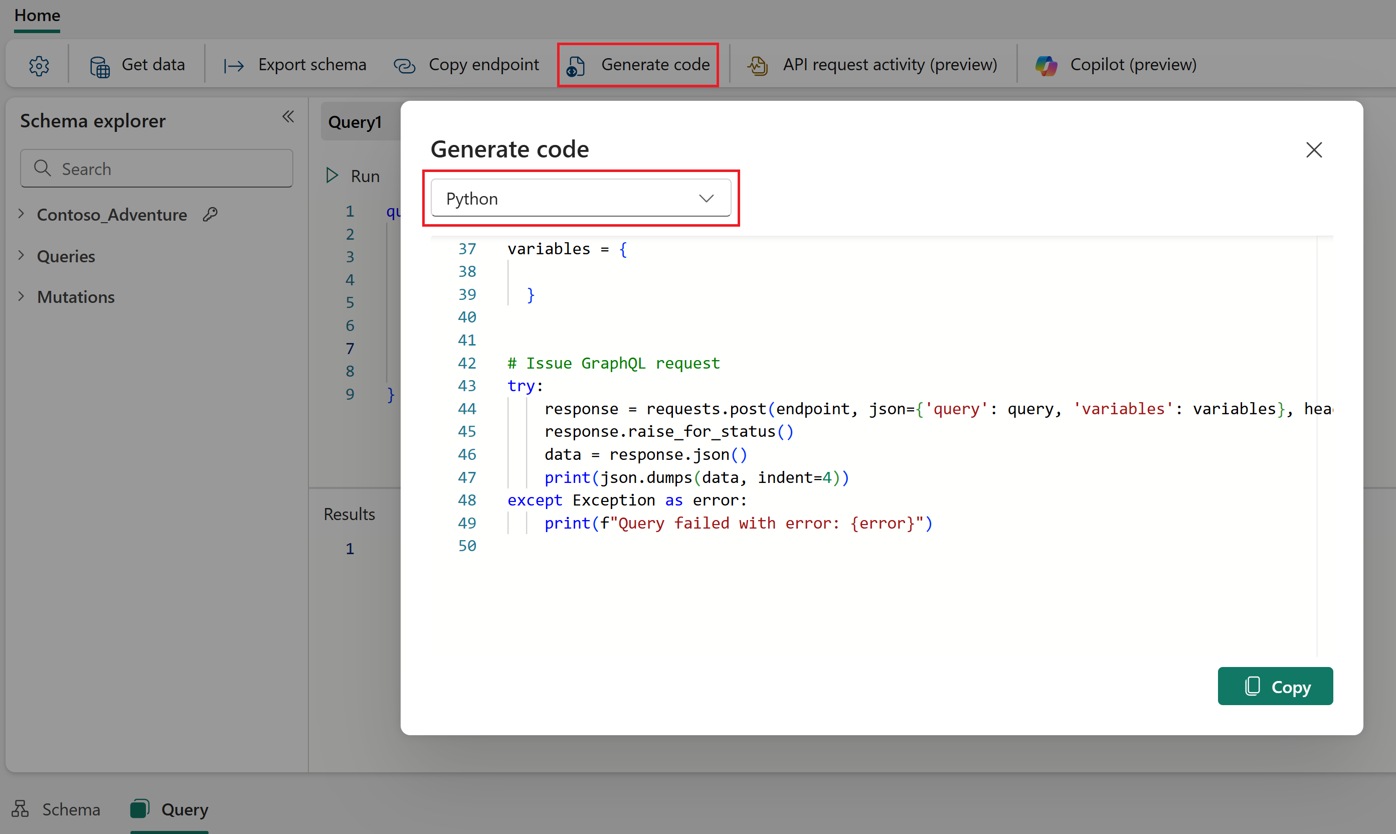 API-editoren genererer automatisk boilerplate Python- eller Node.js-kode, der afspejler den GraphQL-forespørgsel eller mutation, du i øjeblikket tester i editoren. Når du prototyper og forfiner dine forespørgsler, opdateres den genererede kode derefter. Når du er tilfreds med resultaterne, kan du se og kopiere den genererede kode til at køre lokalt til testformål eller genbruge den i din applikationsudviklingsproces.