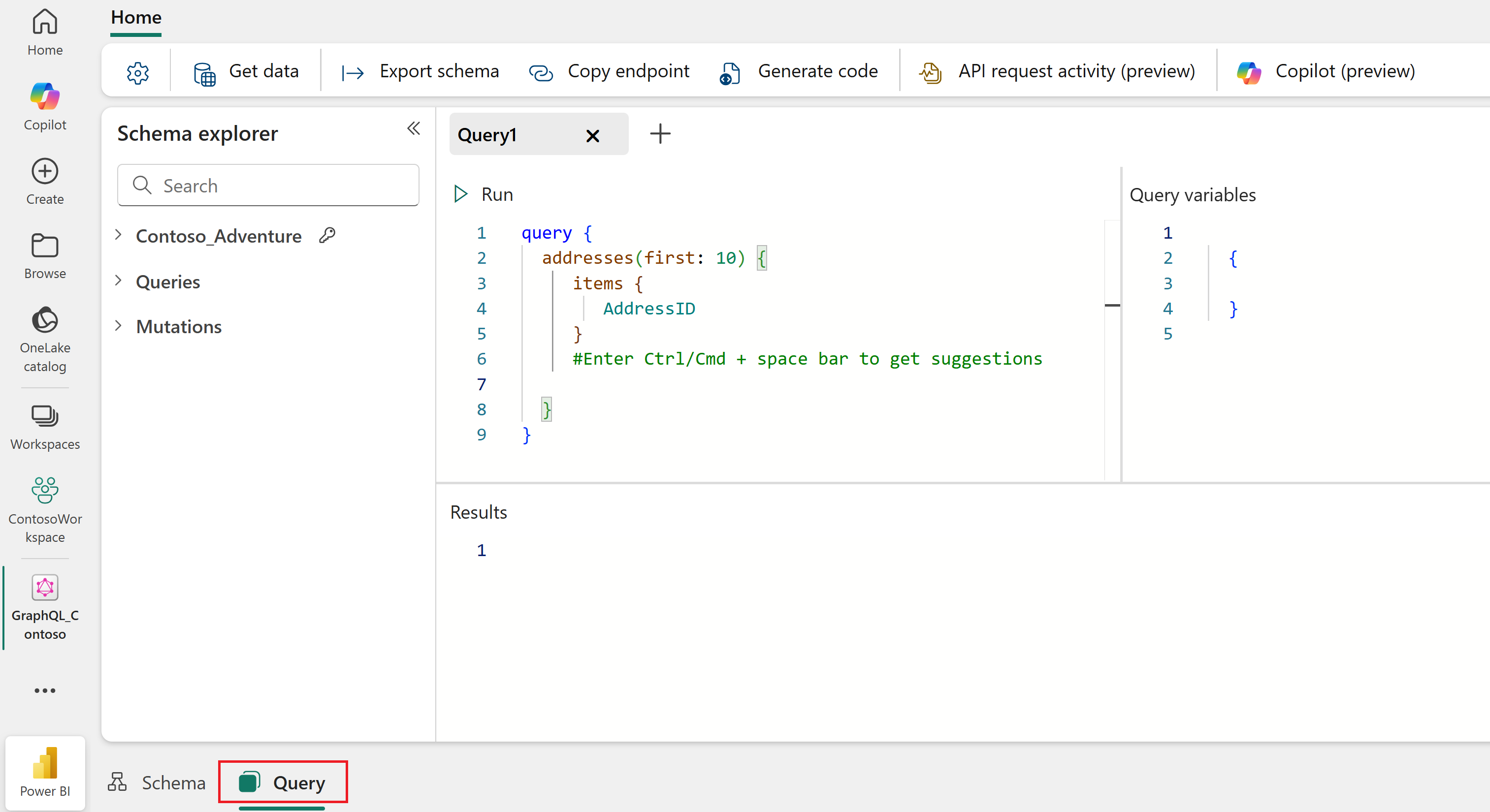 Brug editoren, når du har brug for interaktivt at udvikle, teste eller fejlfinde GraphQL-forespørgsler mod dine Fabric-datakilder.