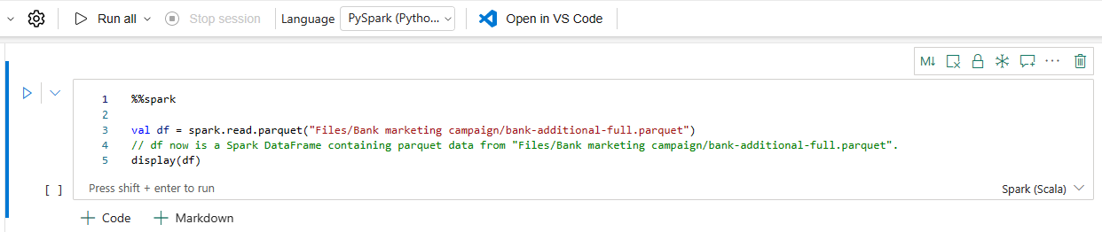 Du skal have en aktiv Apache Spark-session for at kunne bruge fuldførelsen af IntelliSense-koden.